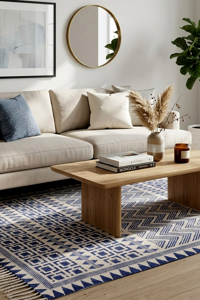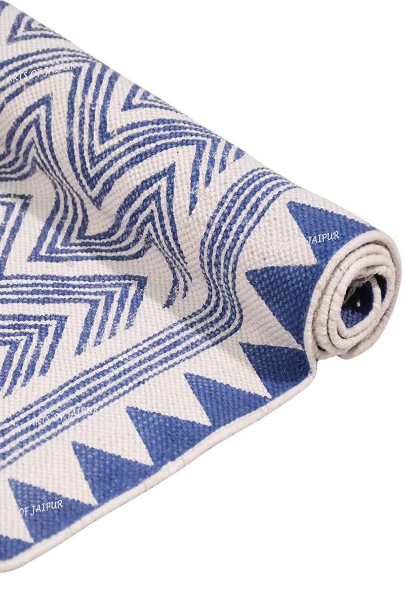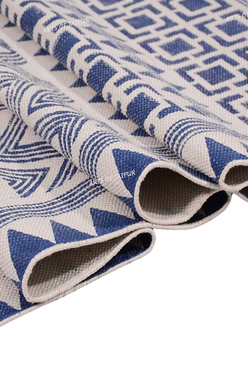 Made from comfortable and breathable cotton fabric, this blue geometric rug is light in weight, strong, and easy to maintain, ensuring it is perfect for daily use in your living space. Its design is perfect for matching with any décor, both in a monochromatic and bold color scheme, allowing you to style it in different ways to suit your living space. This rug is perfect for placing under your coffee table or beside your bed to add a cozy and vintage vibe to your living space.