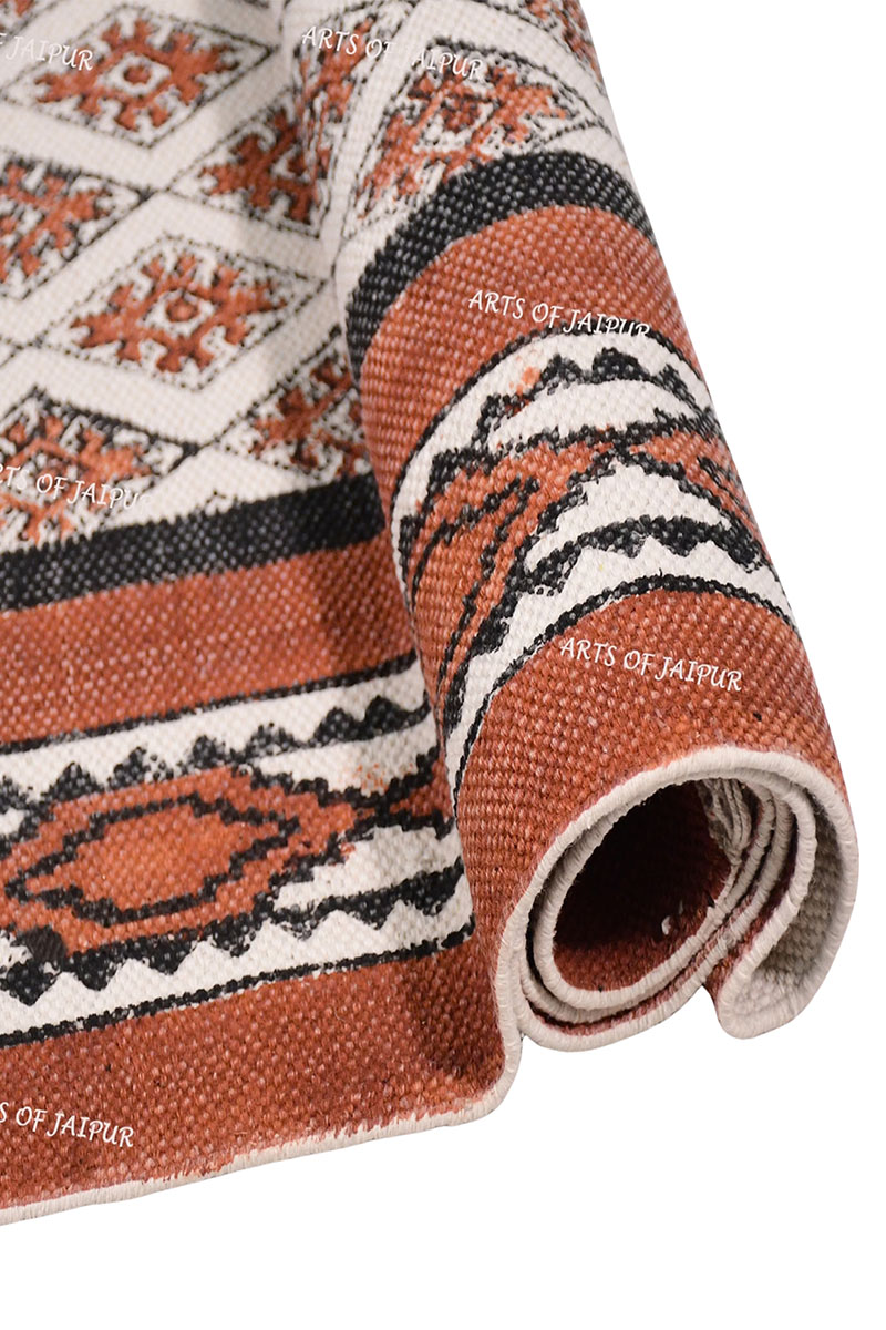 Hand block printed cotton rug is a perfect combination of traditional artistry and contemporary design. The rugs are made of cotton, a breathable fabric, and have intricate designs carefully stamped on them by skilled artisans using wooden blocks. Each rug is unique and will add a touch of warmth and texture to any room with its colorful design.