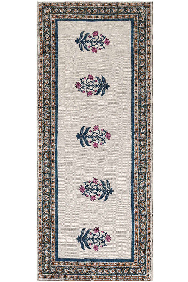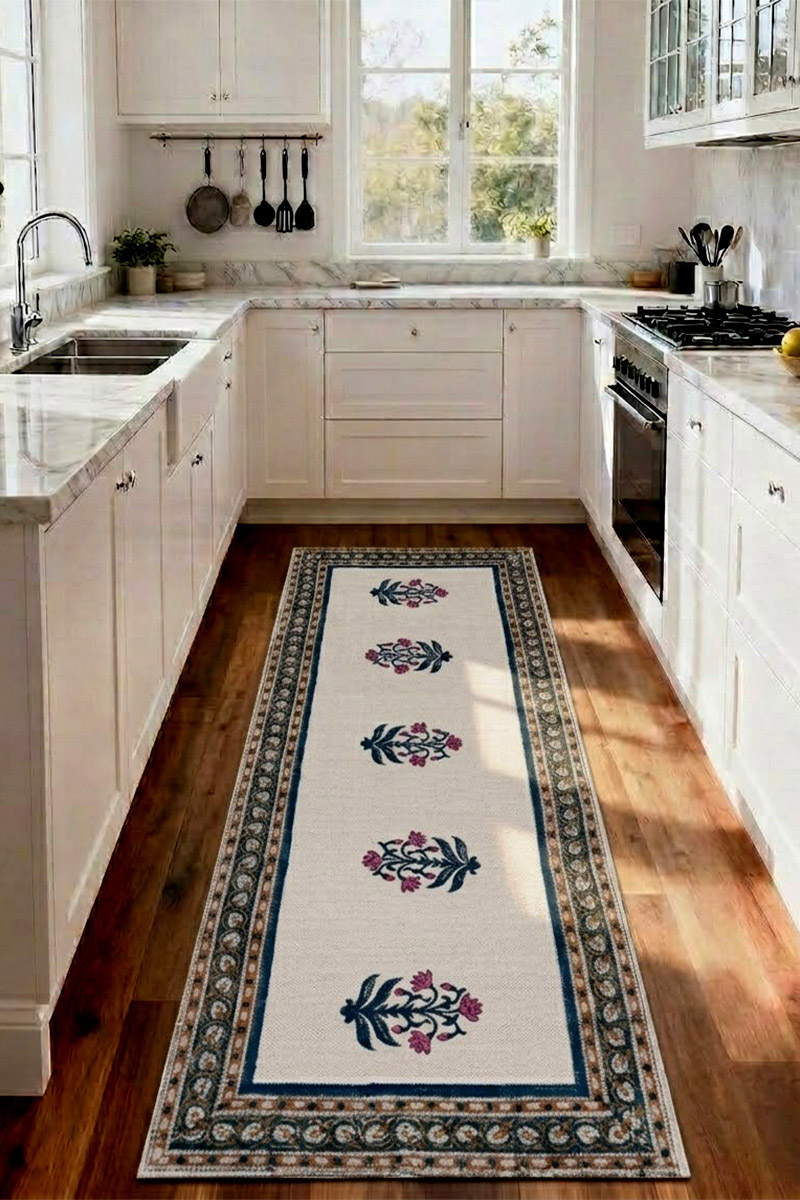 Elegant Blue Floral Block Print Runner Rug for Hallway & Living Room