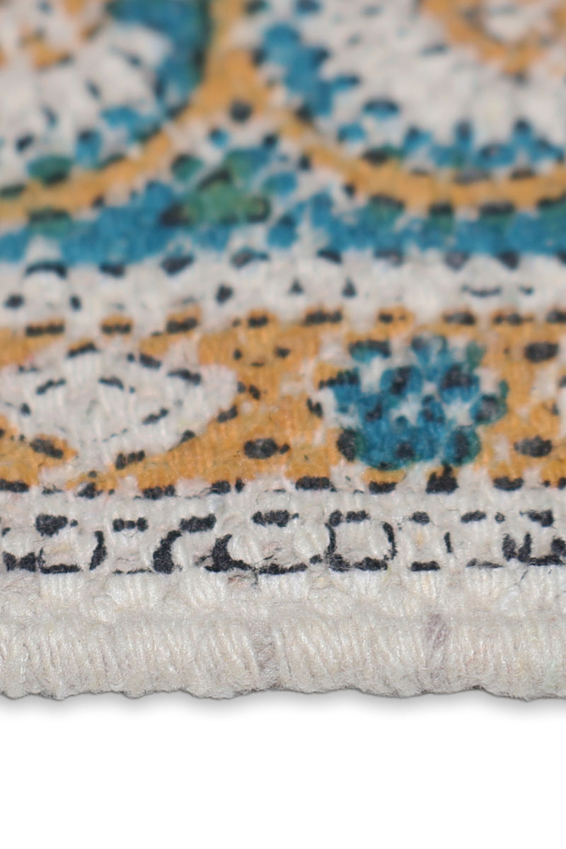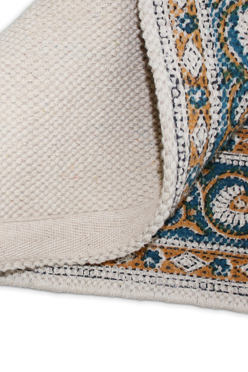 Hand block printed cotton rug is a perfect combination of traditional artistry and contemporary design. The rugs are made of cotton, a breathable fabric, and have intricate designs carefully stamped on them by skilled artisans using wooden blocks. Each rug is unique and will add a touch of warmth and texture to any room with its colorful design.
