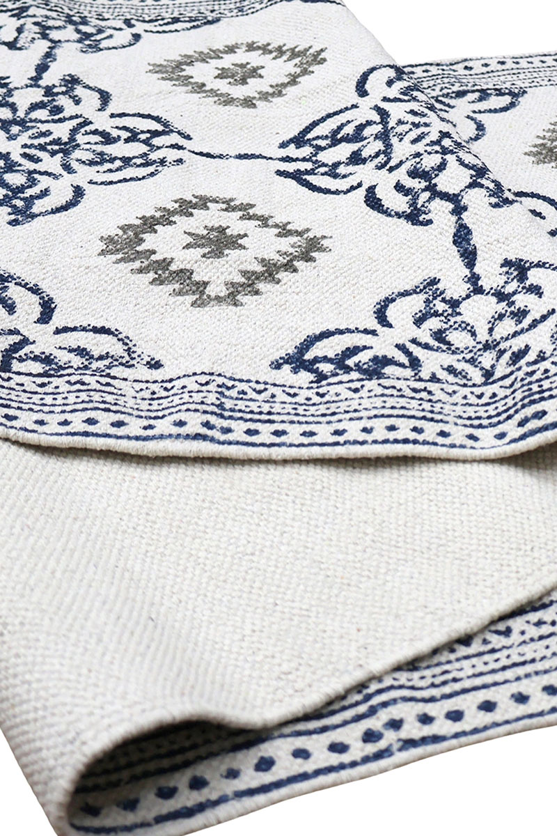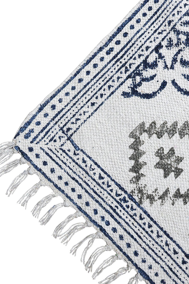 Hand Block Printed Blue Cotton Carpet for Living Room