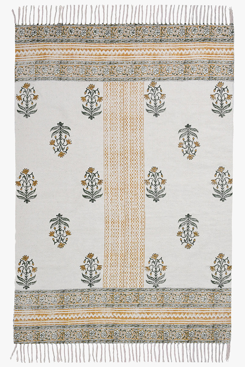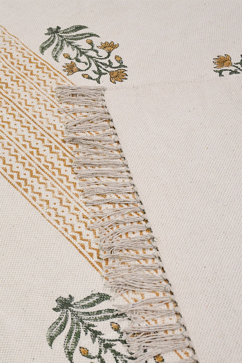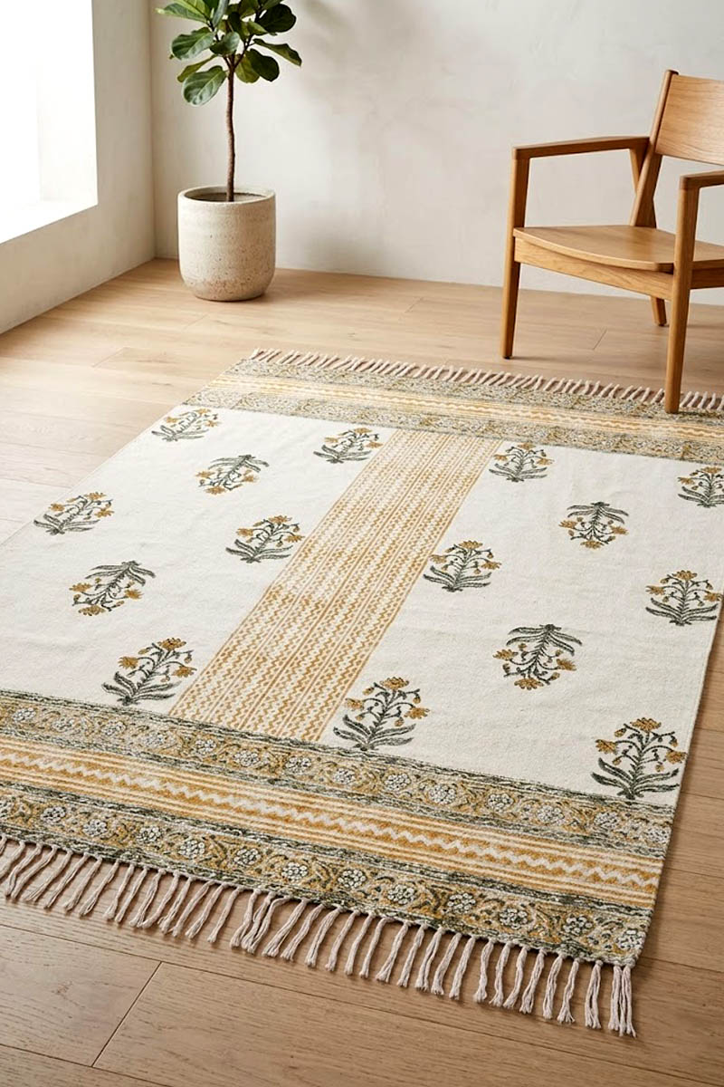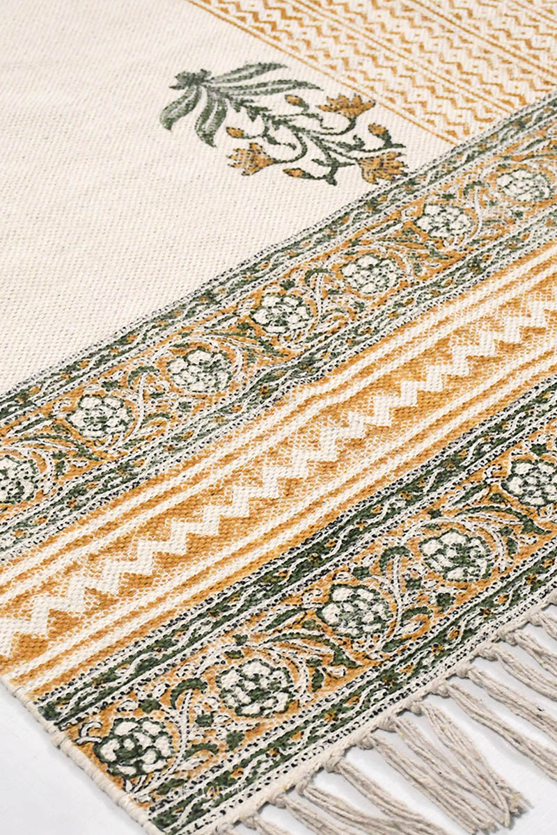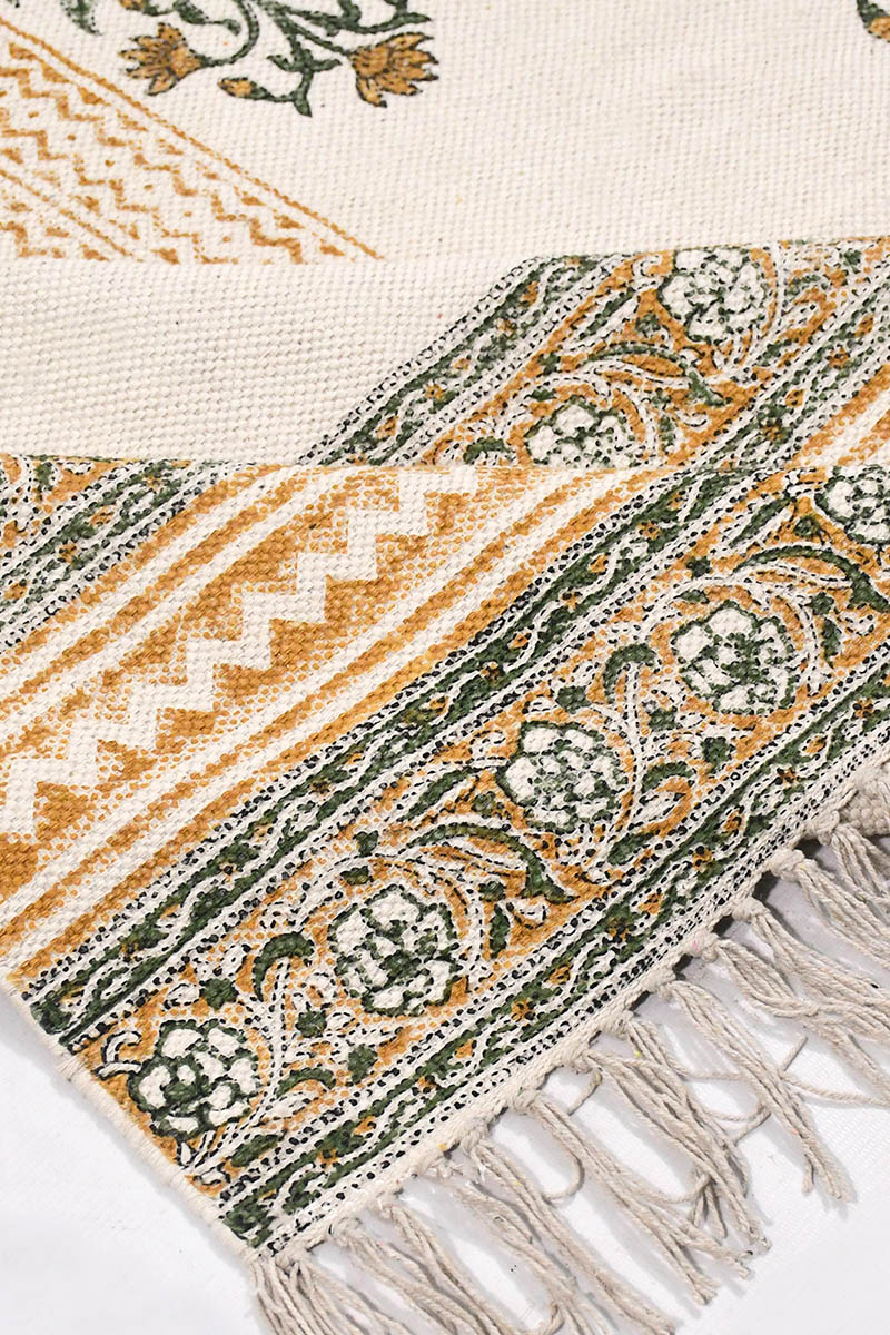 Hand Block Printed Cotton Rug Yellow Floral Indian Dhurrie