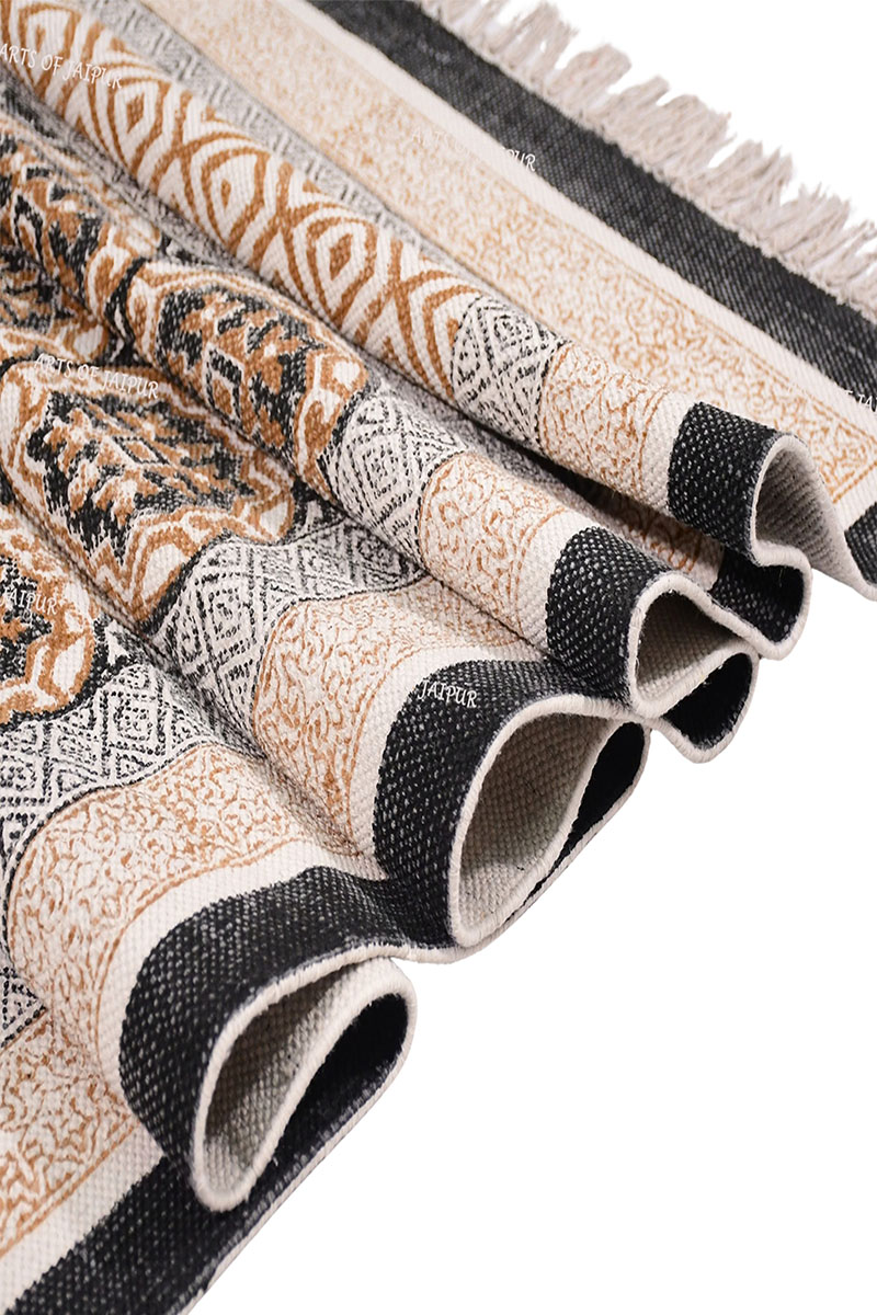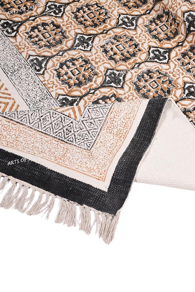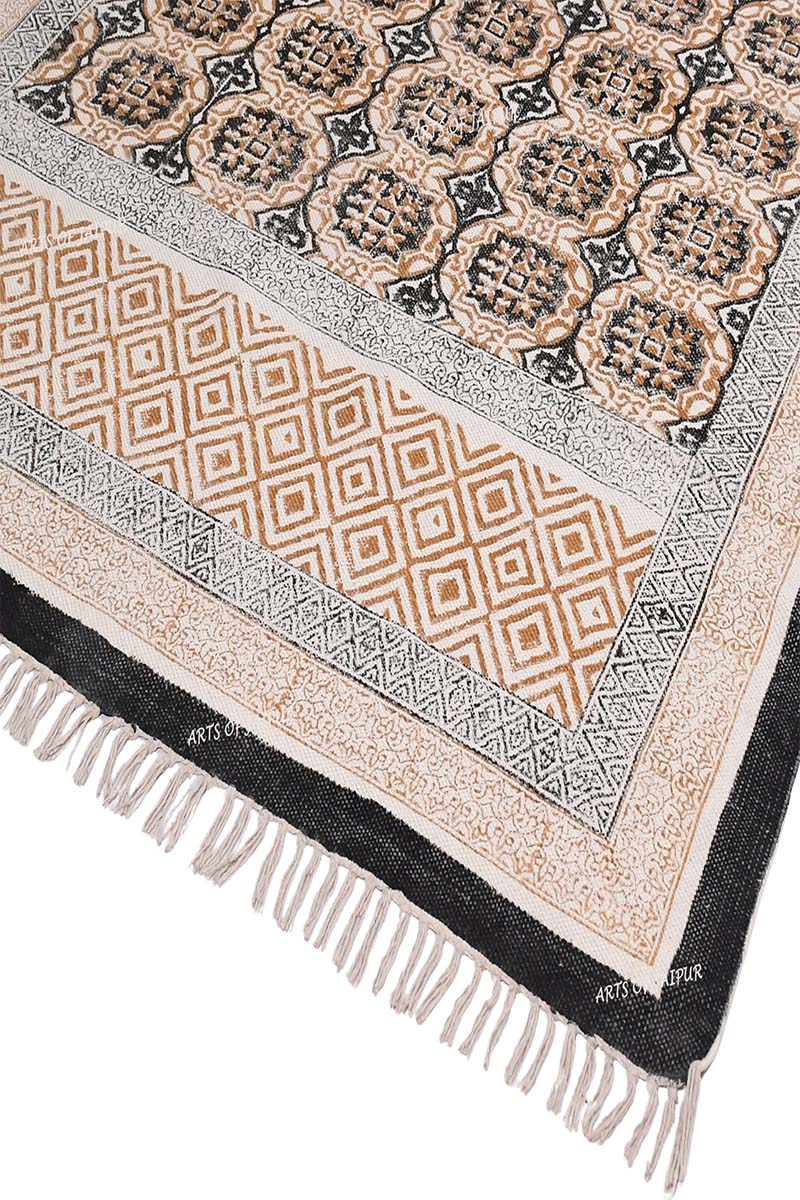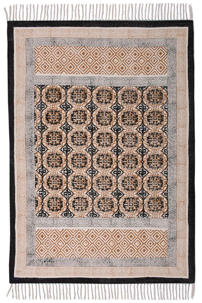 Geometric design on a cotton rug made using traditional hand-block printing techniques with intricate brown and black patterns and a vintage border. The geometric design on this cotton rug is perfect for adding a touch of warmth and elegance to living rooms and bedrooms alike.