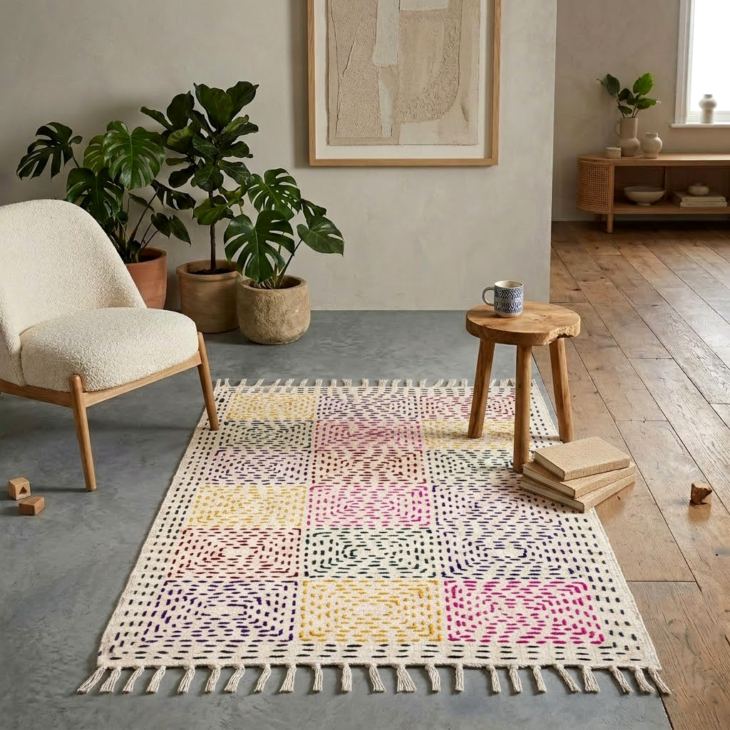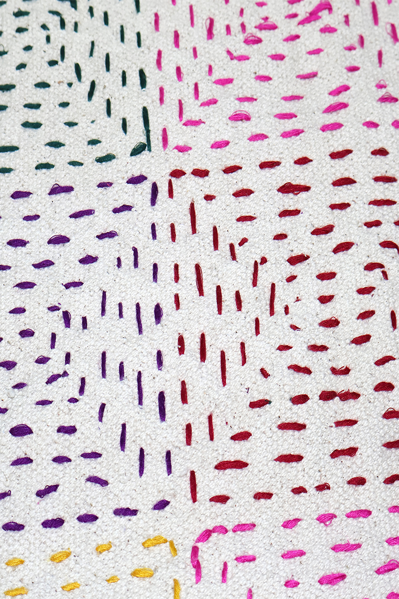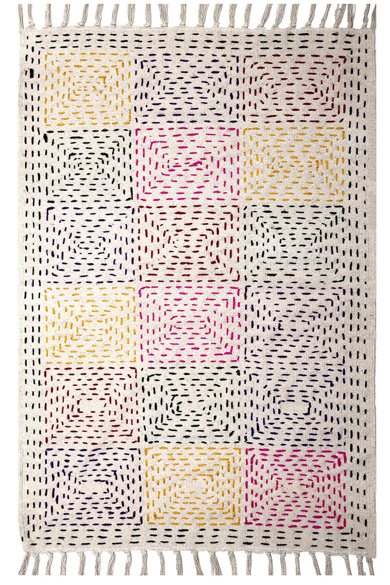 Kantha Cotton Rug with Geometric Hand Stitched Artisan Dhurrie